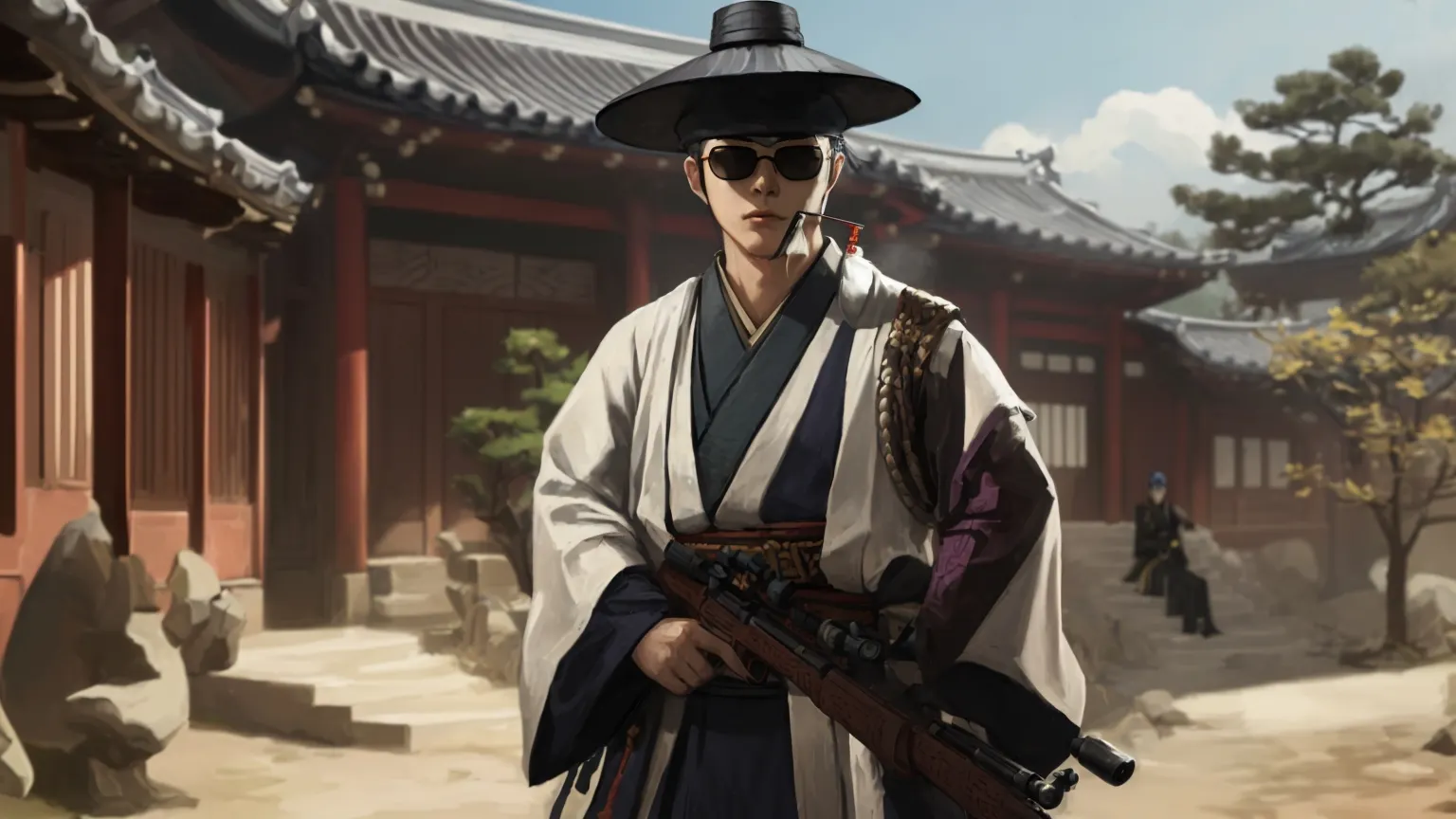 A scholar from the Joseon Dynasty wearing sunglasses with a Korean house behind him, looking like a game character holding a sniper gun in his right hand.