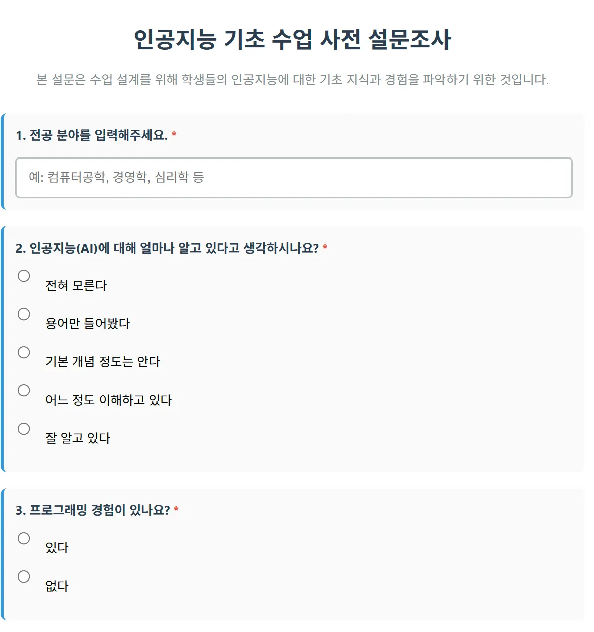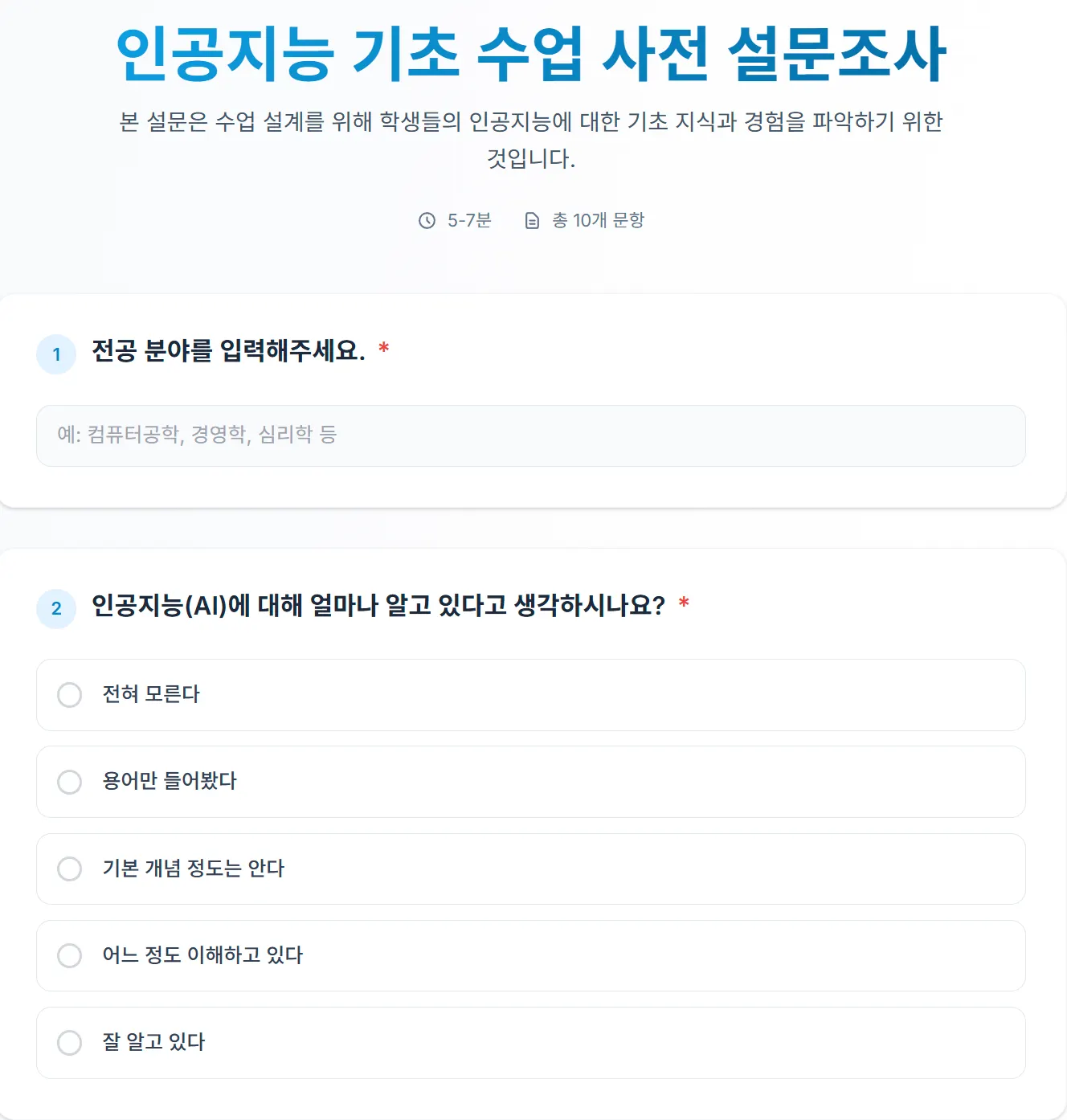 인공지능 기초 수업을 설계하는 사람이야. 학생들이 인공지능에 대해 어디까지 알고 있고, 어떤 서비스를 사용했는지 등에 대한 내용을 담은 설문문항을 만들려고해.  먼저 Json파일로 설문지를 만들어줘