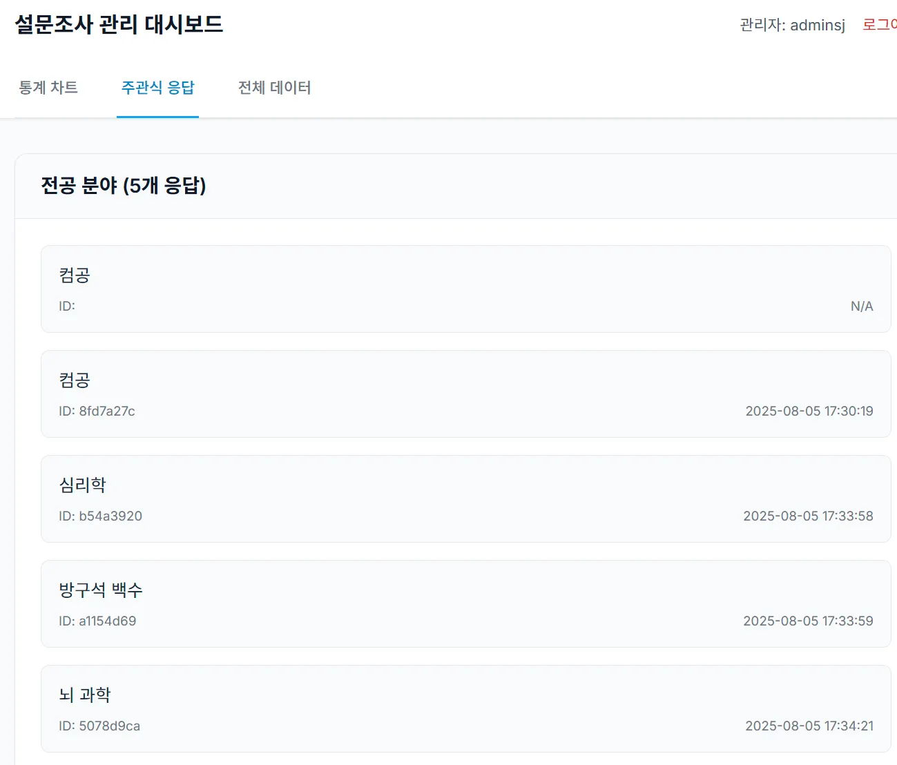 사용자의 주관식 응답도 모두다 모아서 보여줘