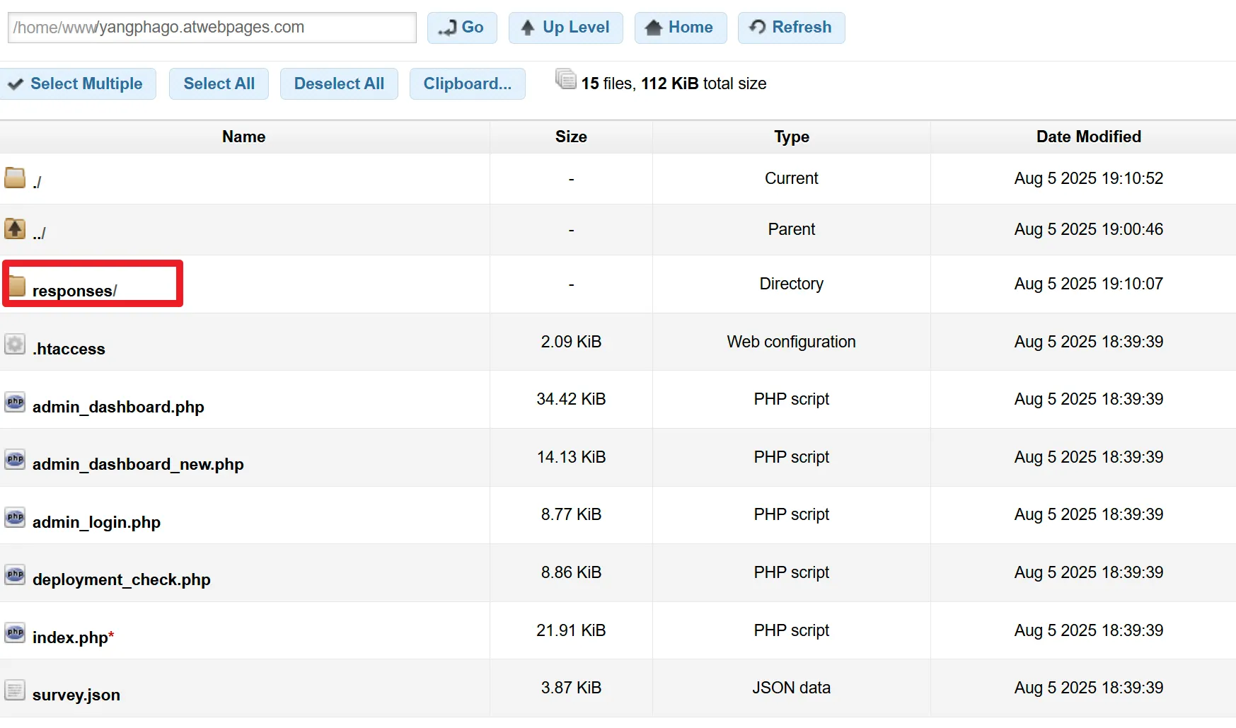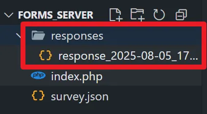 설문응답자가 설문조사를 체크하고, 입력한뒤, 제출버튼을 누르면, 사용자들이 작성한 데이터가 Json 파일로 Reponse폴더에 저장될 수 있도록 코드 수정해. Reponse폴더가 없다면 새로 만들어야 해