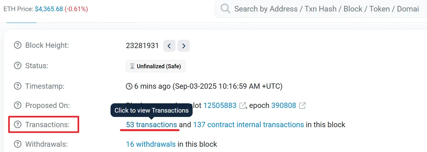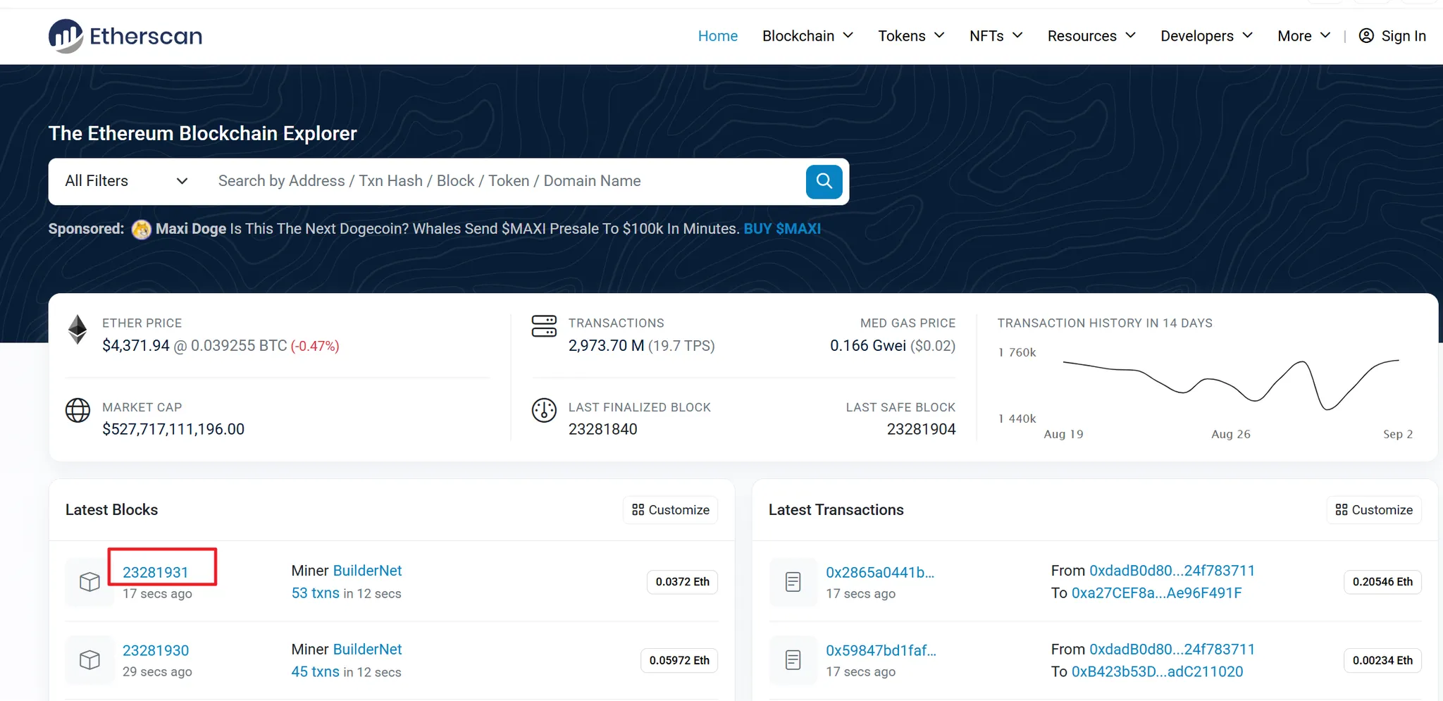 이더리움 블록체인 공개사이트에서 가장 최근에 생성된 블록 번호를 확인해보자.