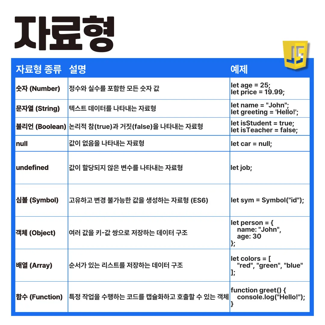 변수 선언  | let, const, var  | 바로 사용  | JS는 명시적 선언  |