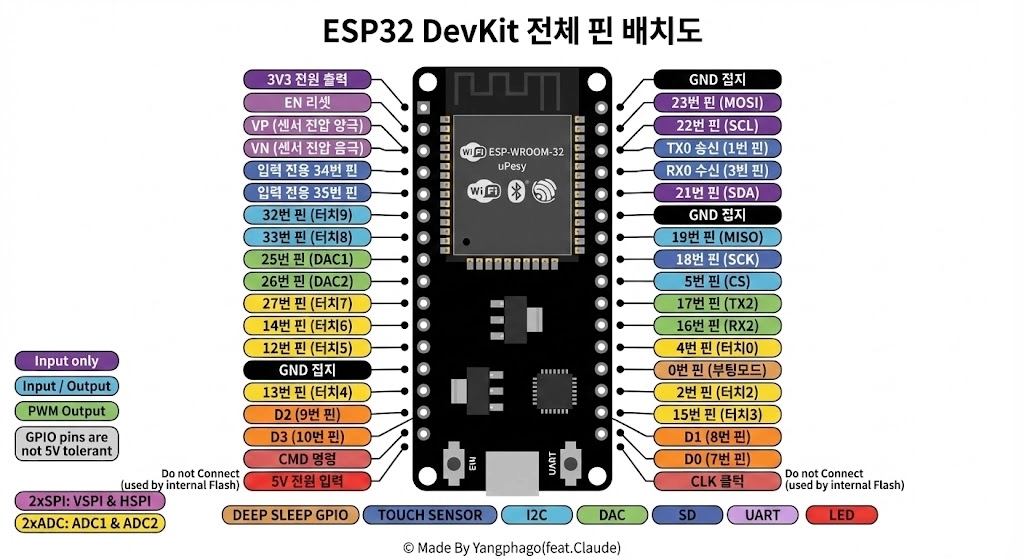 Top text: "ESP32 DevKit 전체 핀 배치도"