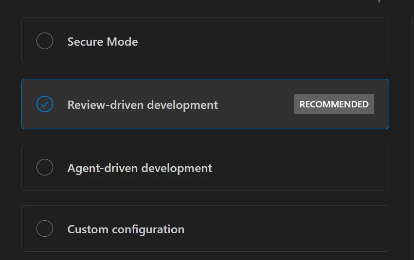 Review-driven (기본 권장, 검토 요청): 에이전트는 터미널 명령(허용 목록에 있는 명령 제외)을 실행하기 전에 항상 확인 요청을 합니다.