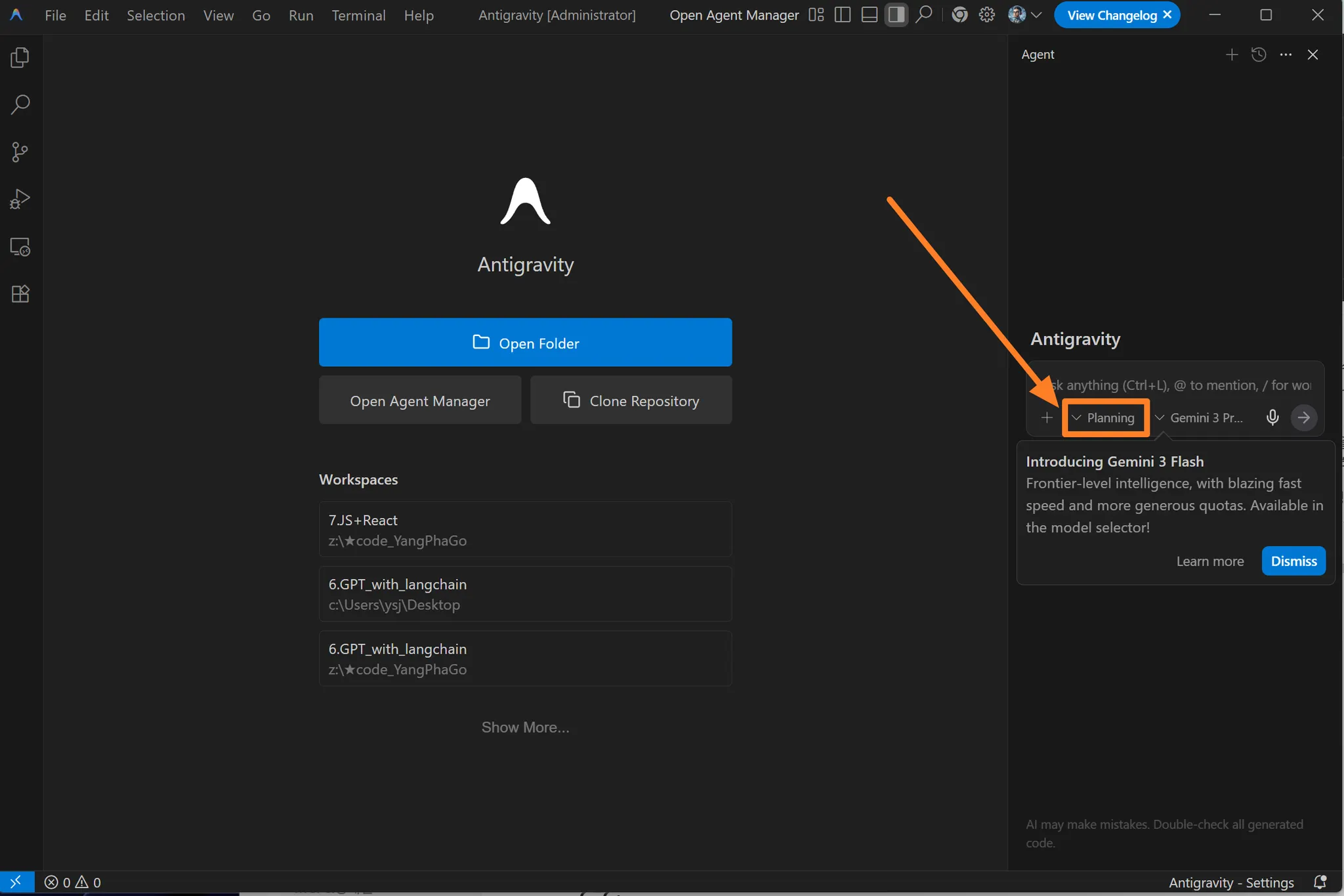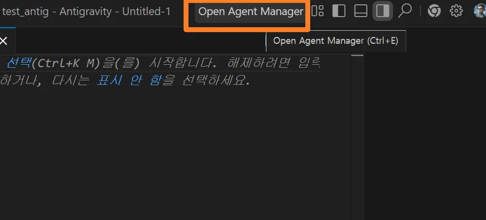 vsc가 code edit화면이 주라면, Antigravity는 Agent Manager가 주가 된다는 느낌