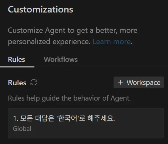아래 그림 처럼 Agent의 대답을 한글로 해달라는 전체 규칙을 생성