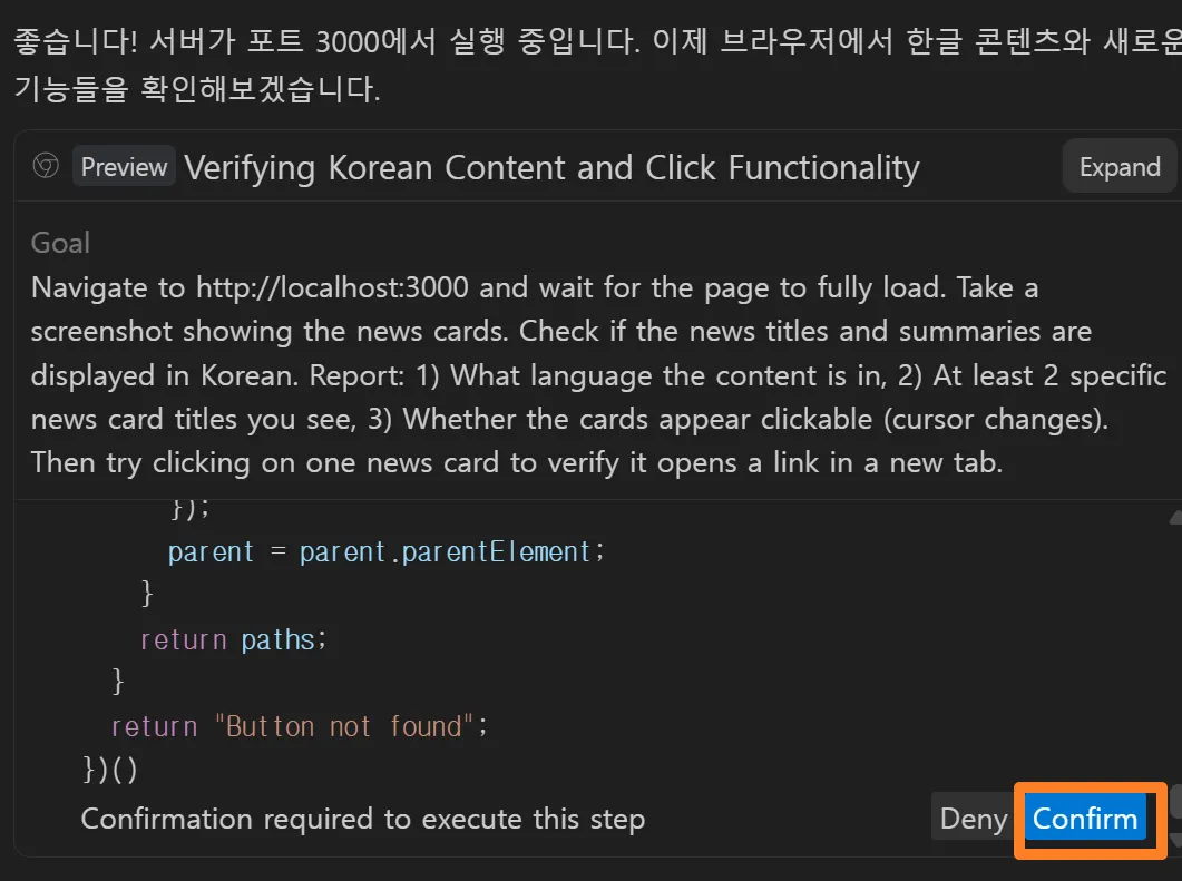 에디터, 터미널, 브라우저까지 직접 제어 가능하기에 ‘자체테스트 해’한 마디면 알아서 디버깅까지 진행됨
