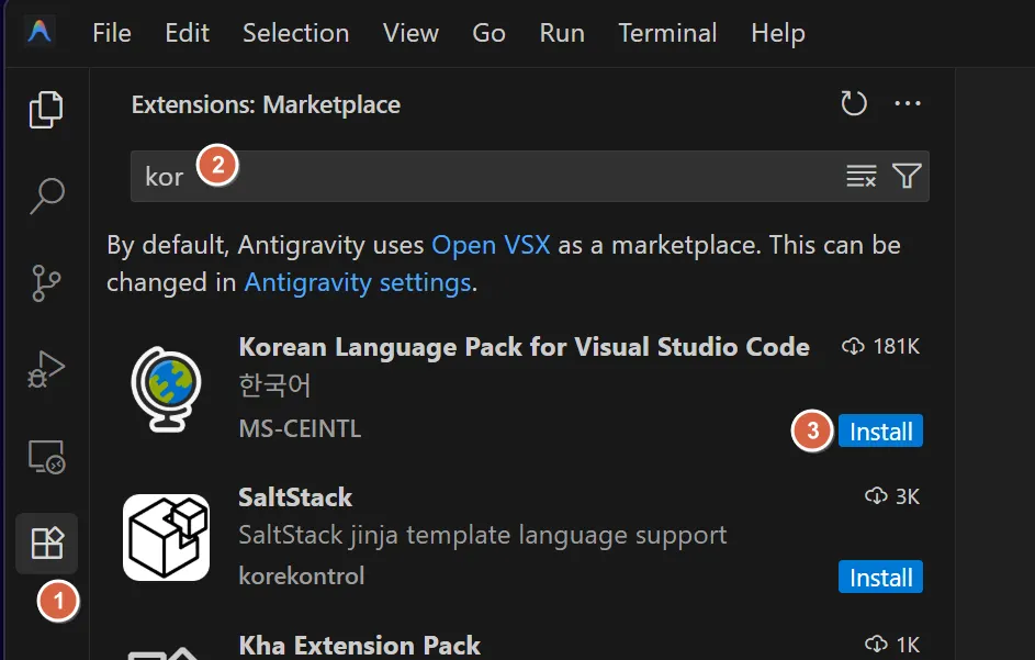 한글 설정으로 변경하기, 설치후 안티그래비티를 재시작해야 반영됨