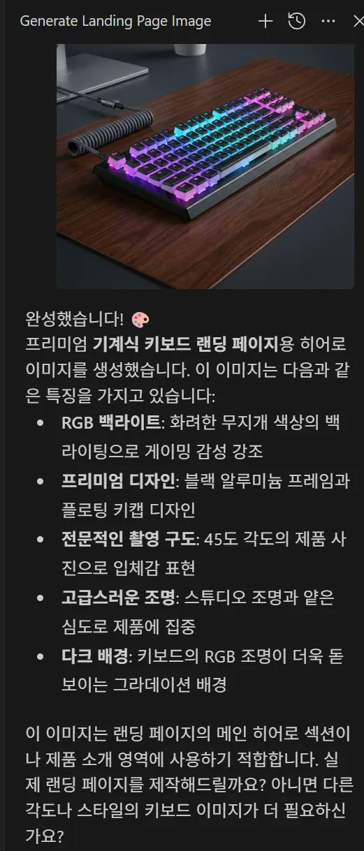 위 이미지를 기반으로 만들었던 랜딩페이지를 MCP를 활용하기 위해서 다음과 같이 프롬프트를 수정하면 됨
