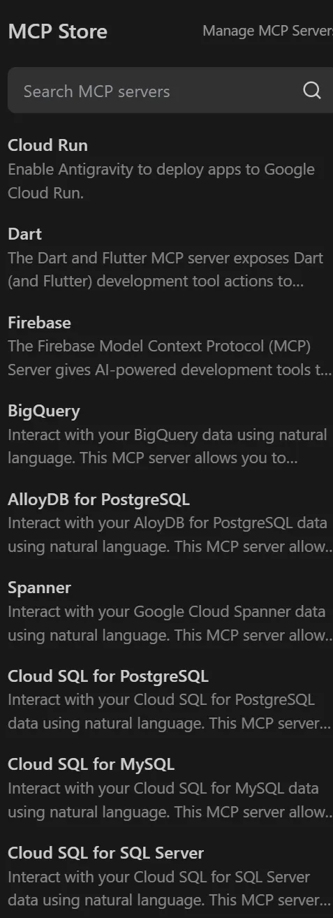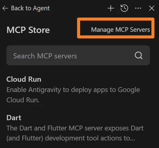 기본적으로 안티그래비티에는 MCP를 바로 설치할 수 있는 기능이 탑재됨