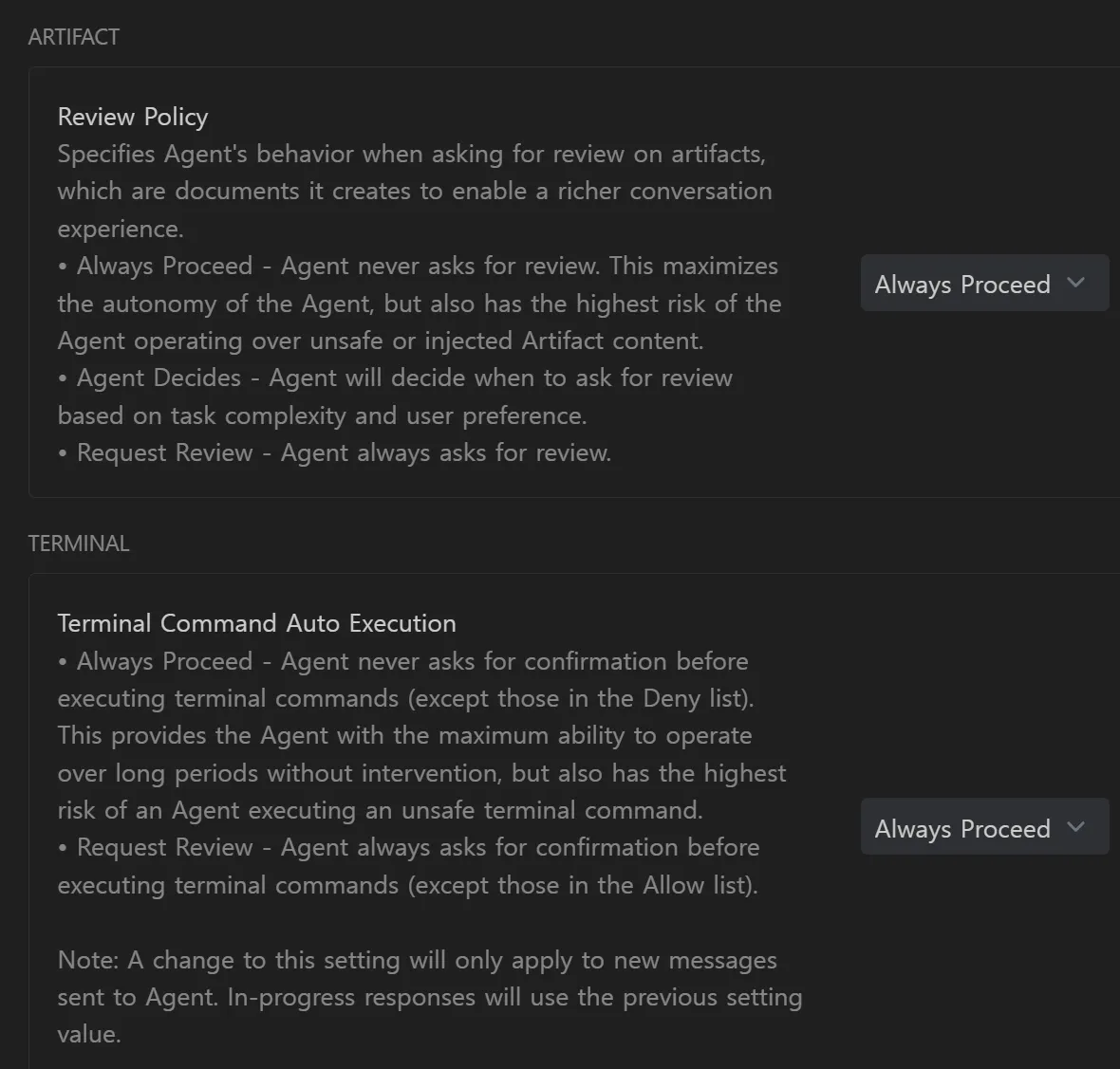 이 옵션을 선택하면 에이전트가 개입 없이 장시간 작동할 수 있지만, 안전하지 않은 터미널 명령을 실행할 위험도 가장 높습니다.
