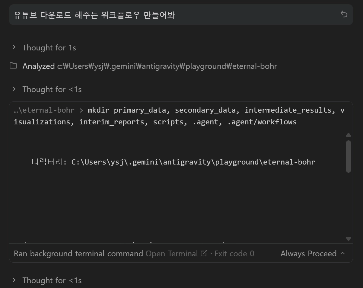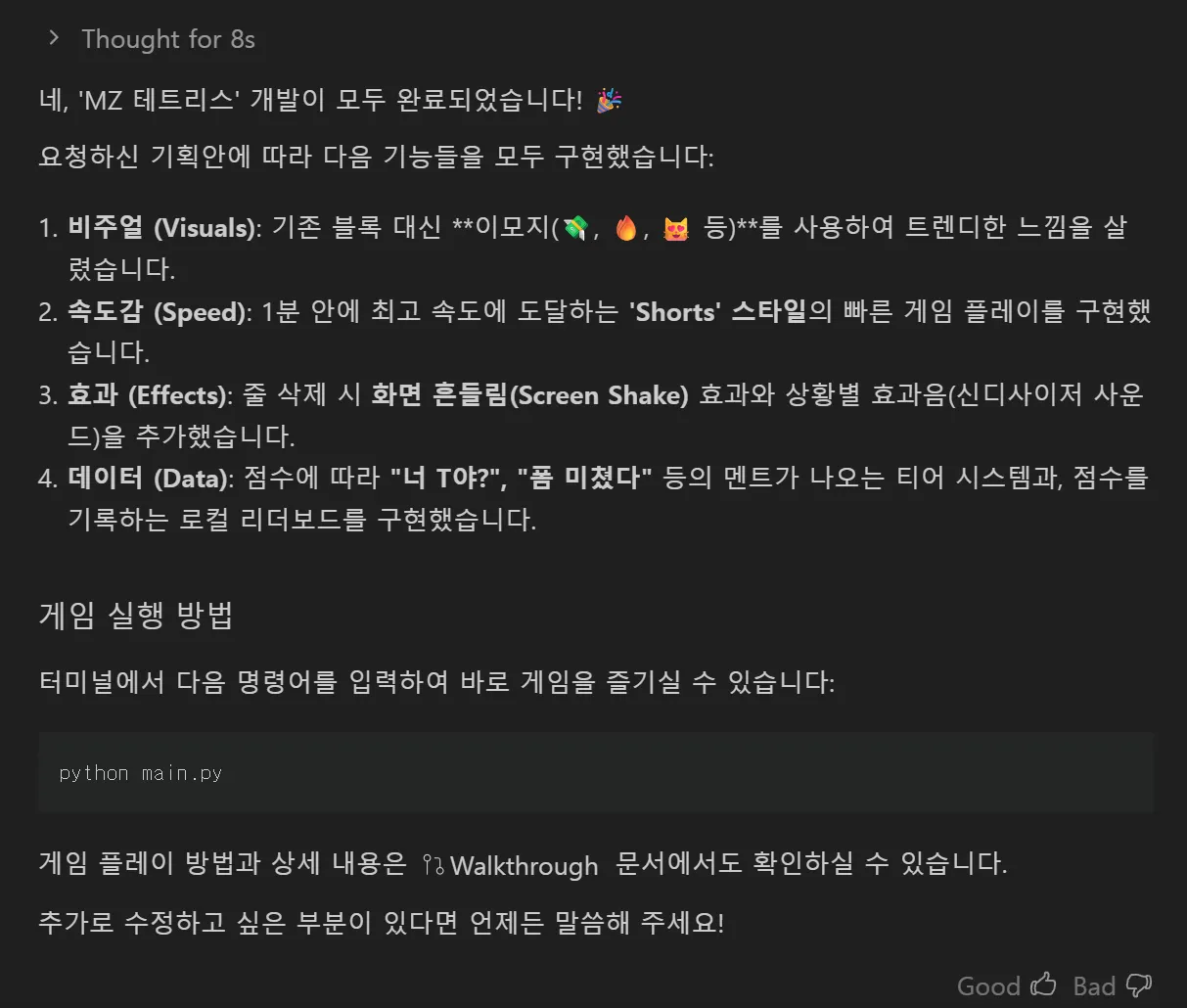 • 자율성: 에이전트가 스스로 에러를 보고 수정(Debug)까지 수행 | • 보안: 의도치 않은 파일 삭제나 외부 패키지 설치 위험 존재