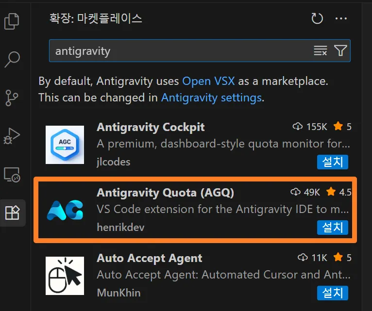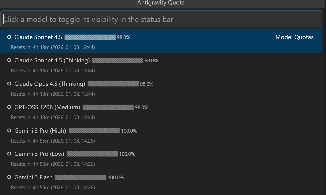 VS Code용 경량 확장 프로그램으로, Antigravity AI 모델 사용량 할당량을 모니터링하고 상태 표시줄에 표시해줌