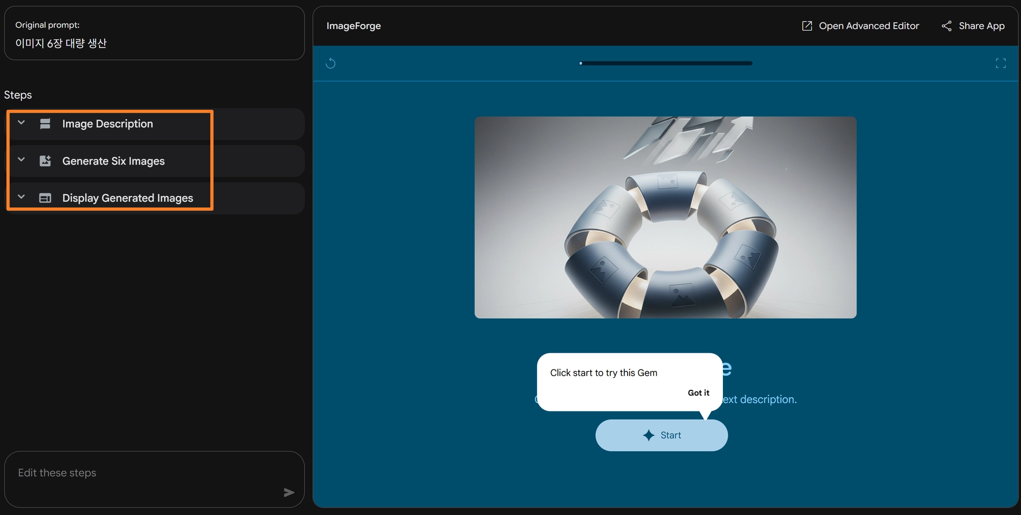 opal은 노코드(No-code) AI 앱 빌더이므로 자동화 하고 싶은 내용을 자연어로 프롬프트 입력
