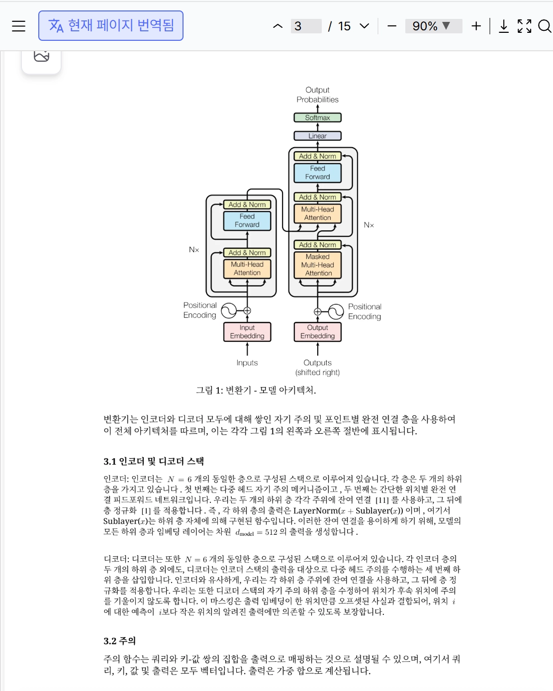 PDF의 영어 내용을 한글로 번역하는 것은 잘 되나 이미지까지 포함된 레이아웃을 유지하는 것은 아직까지 구현에 어려움이 있음
