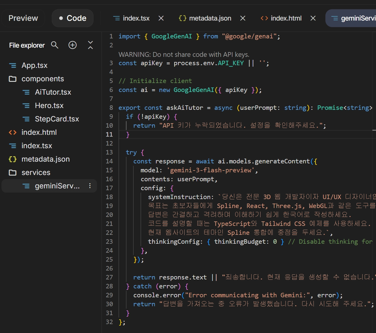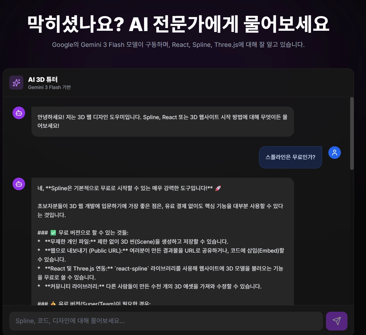 API키를 활용해 Gemini기반 챗봇까지 들어가 있는 훌륭한 결과를 볼 수 있다!