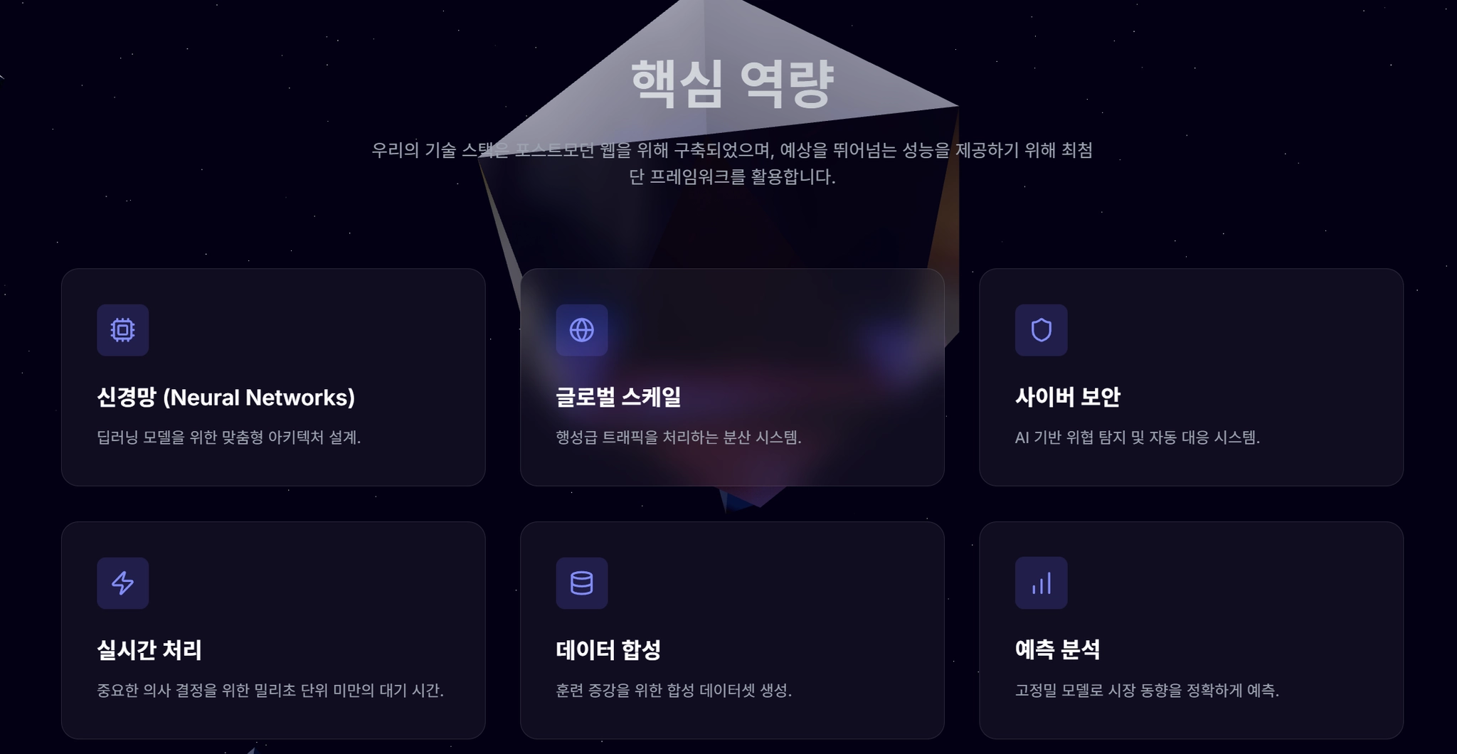 오브젝트: 중앙의 추상적 크리스탈 (정이십면체) + 떠다니는 유리 파편 (정팔면체들).