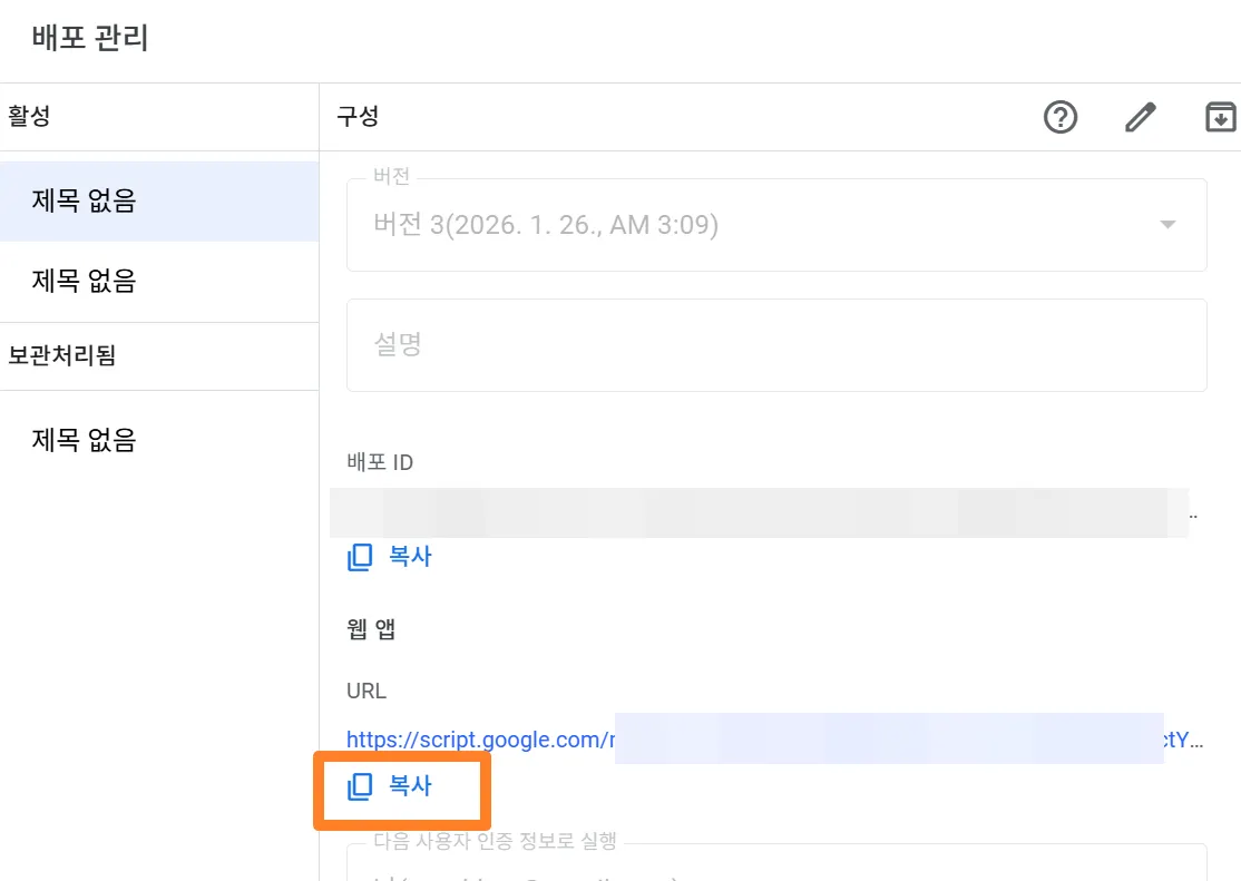 보안: 시트 자체를 전체 공개할 필요 없음 (스크립트 실행 권한만 설정하면 됨)