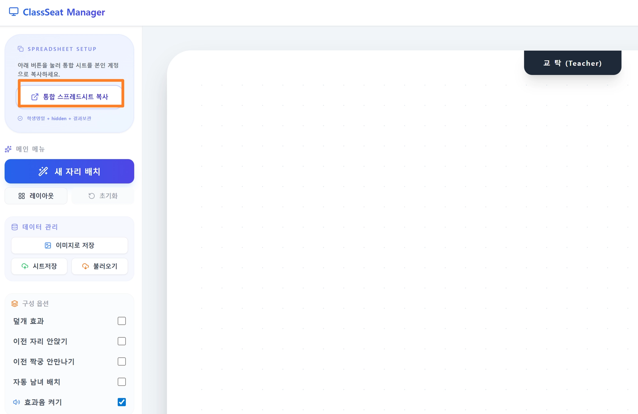 책상 레이아웃 페이지에서 교사가 원하는 책상 배열 가능(저장버튼 필수)