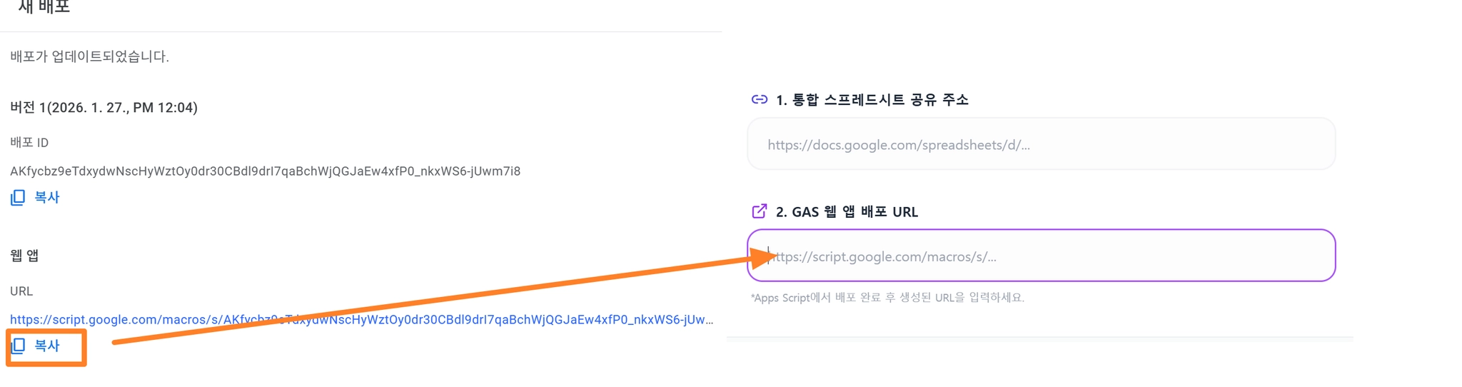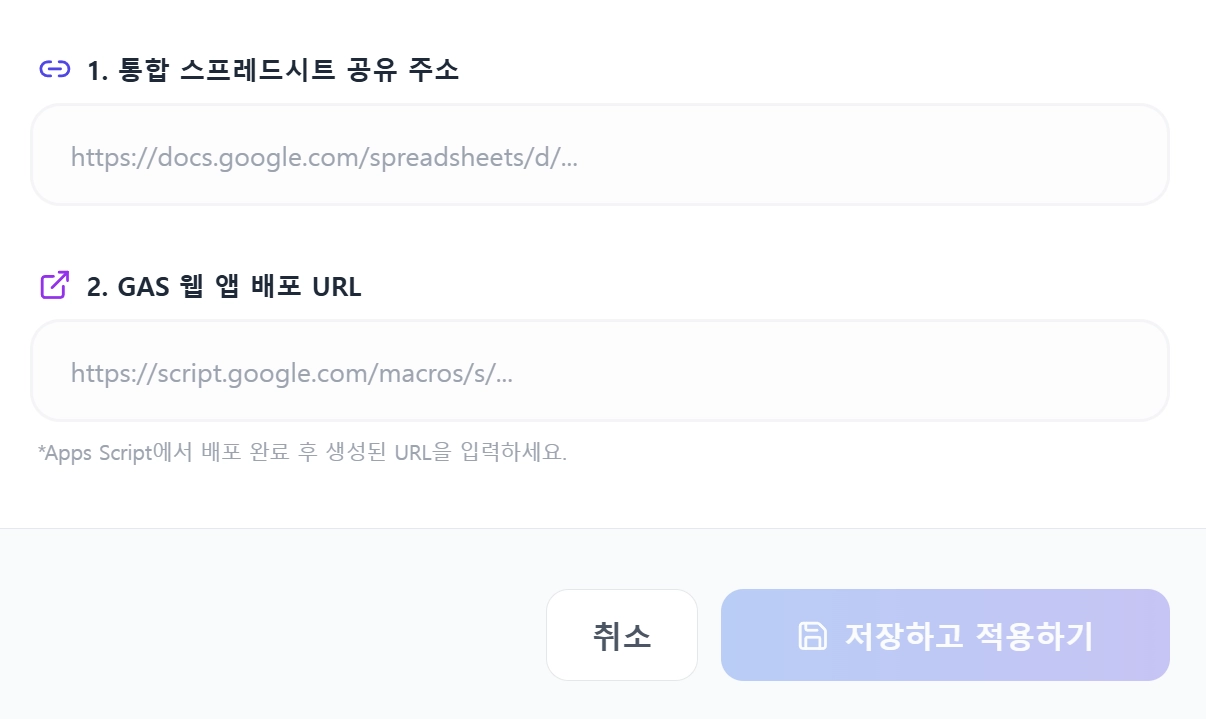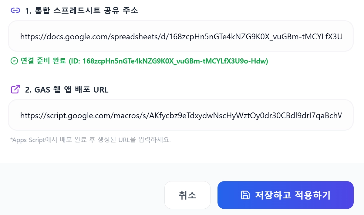 이때 나오는 웹앱 주소를 복사한 뒤, 설정2번’GAS 웹 배포 URL’에 붙여넣기