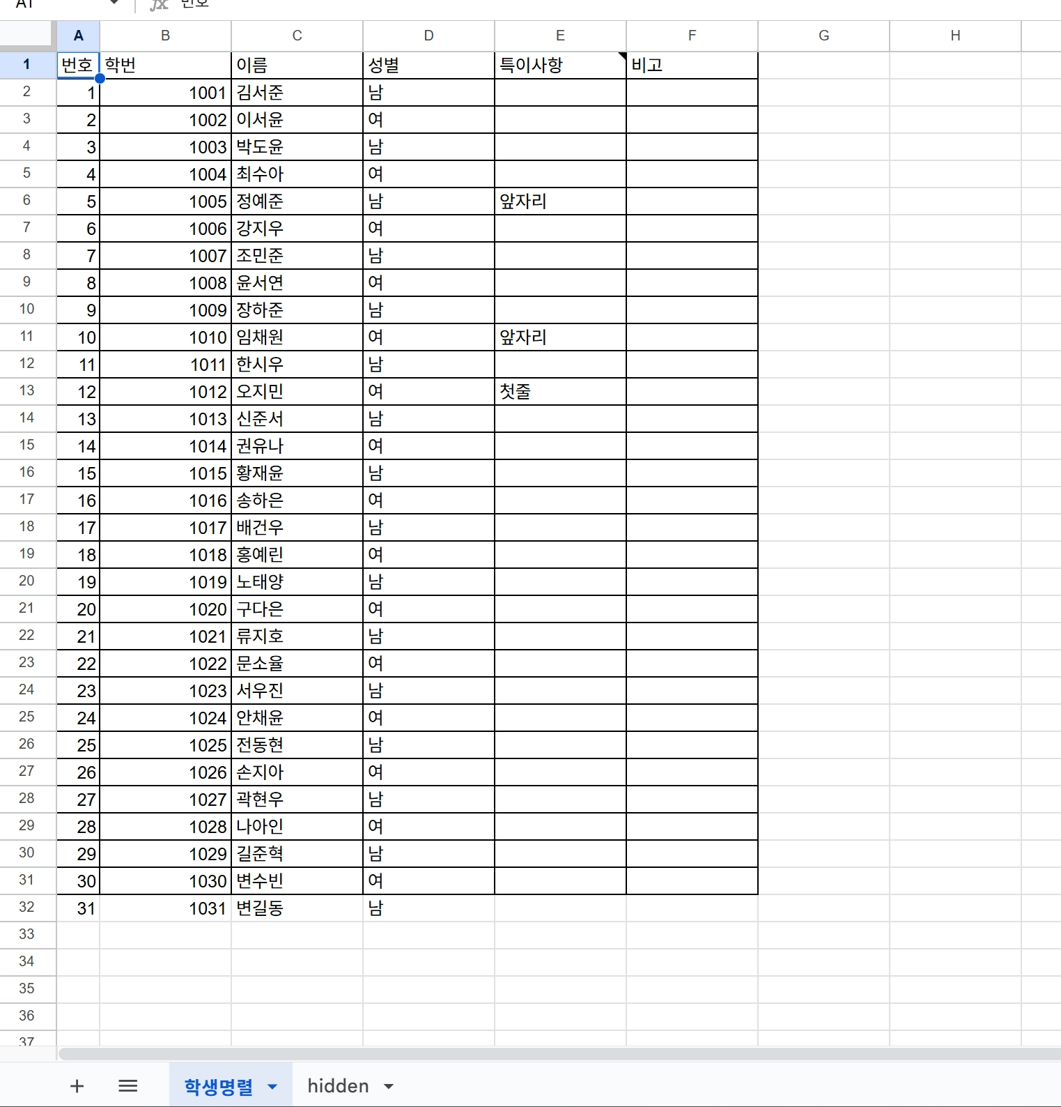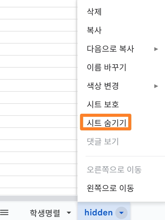 작업이 끝났다면, ‘hidden’시트를 반드시 숨김처리 하여 학생들이 볼 수 없도록 미리 조치해야 함