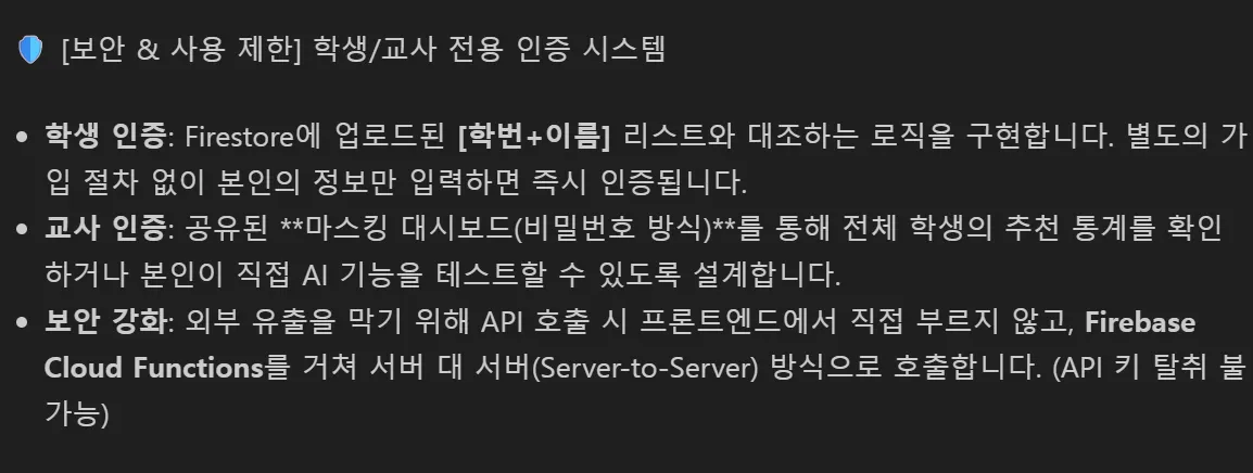 취약점: 현재 VITE_GEMINI_API_KEY를 사용하고 있으며, 이는 클라이언트 사이드(브라우저)에서 바로 호출됩니다.
