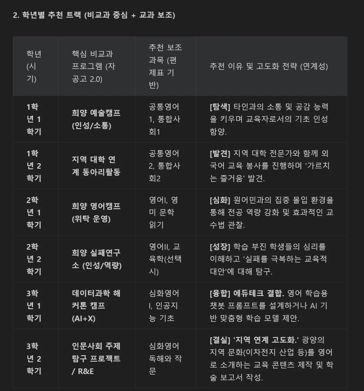 - 이 학생들은 자유학부, 무전공학부에 지원할 가능성이 높기 때문에, 너무 인문쪽 또는 과학쪽으로 치우지지 않고 밸런스있게 이수트랙을 제시해야해