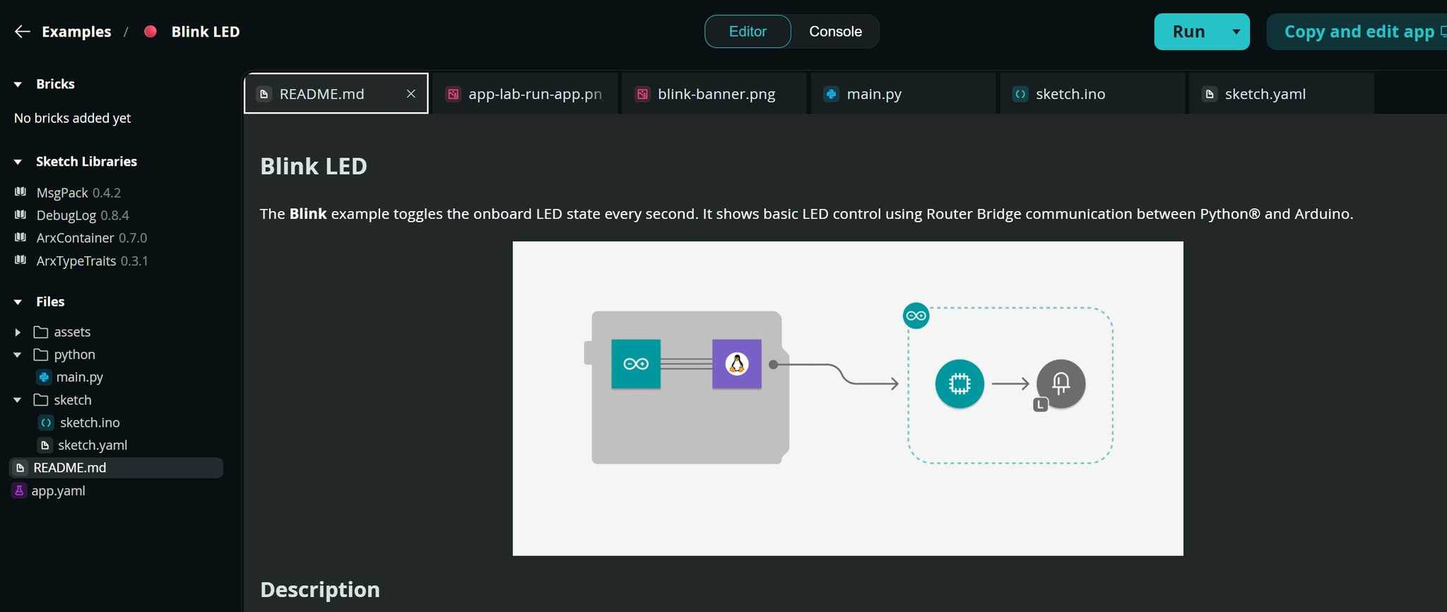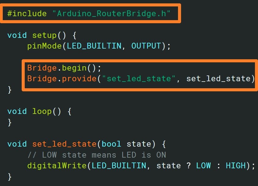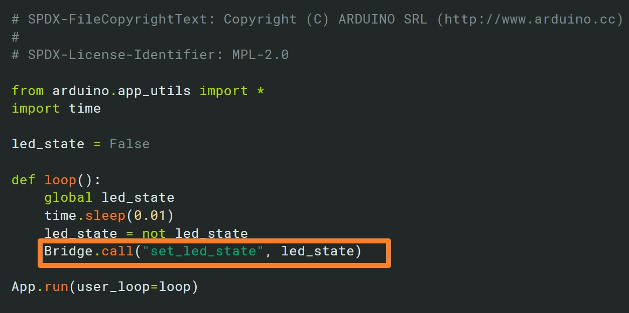 그래서 blink 예제 코드를 볼때, main.py와 sketch.ino에 기존에 없던 Bridge라는 명령어가 있음을 볼 수 있음