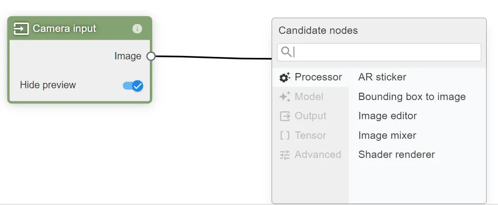 이러한 입력(camera, image, Sketch, Speech, Text 등)을 드래그해서 가져오면, 자동으로 연결할 수 있는 유효한 노드를 확인할 수 있음