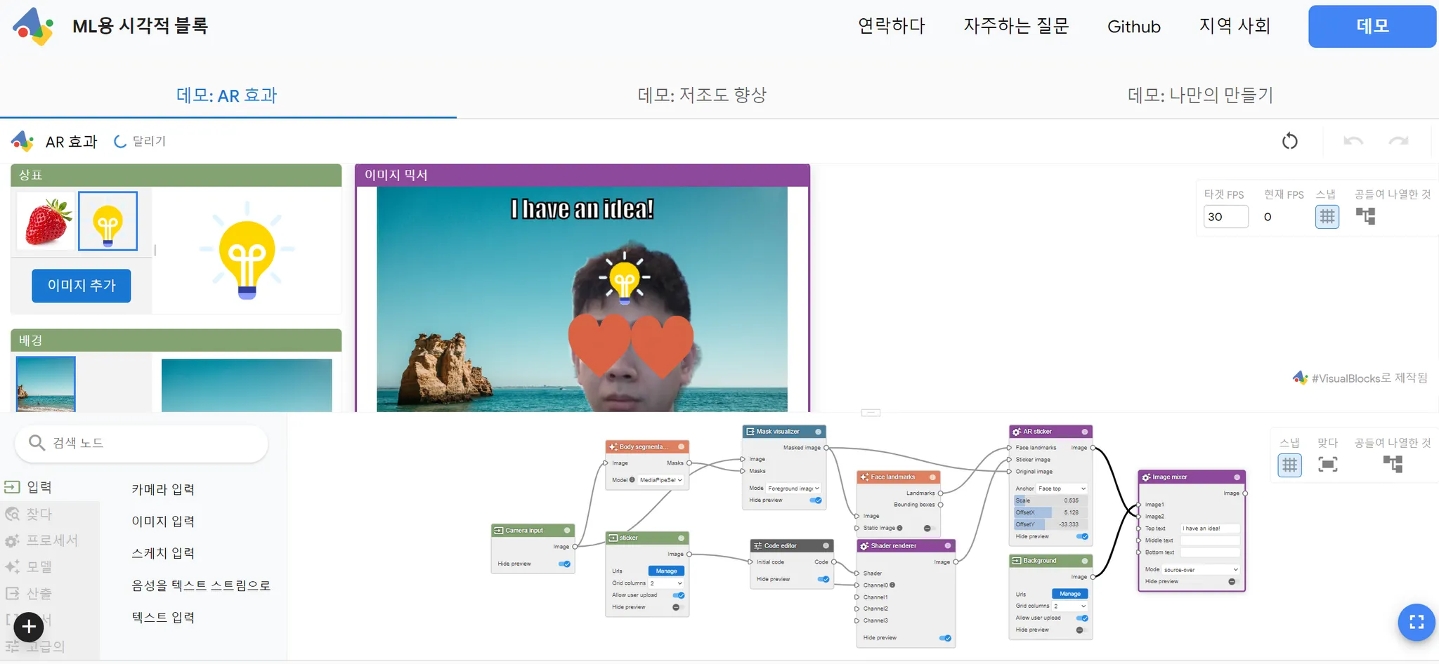 ML용 Visual Blocks는 코드가 없는 그래프 편집기에서 ML 파이프라인을 생성할 수 있는 Google 시각적 프로그래밍 프레임워크입니다. 귀하와 귀하의 사용자는 모델, 사용자 입력, 프로세서 및 시각화를 포함한 드래그 앤 드롭 ML 구성 요소를 연결하여 워크플로의 프로토타입을 신속하게 만들 수 있습니다.