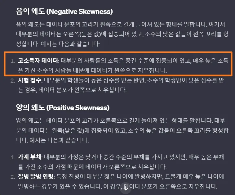 GPT답변 중 양의 왜도가 “소수의 높은 값들이 오른쪽 꼬리를 형성합니다”라고 되어 있음!!