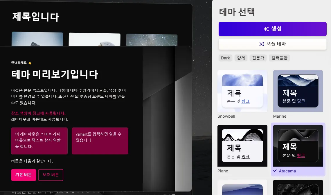 테마를 선택할 수 있고, 테마 선택 후 ‘생성’을 클릭