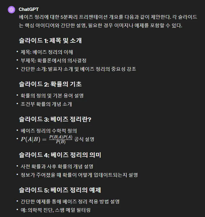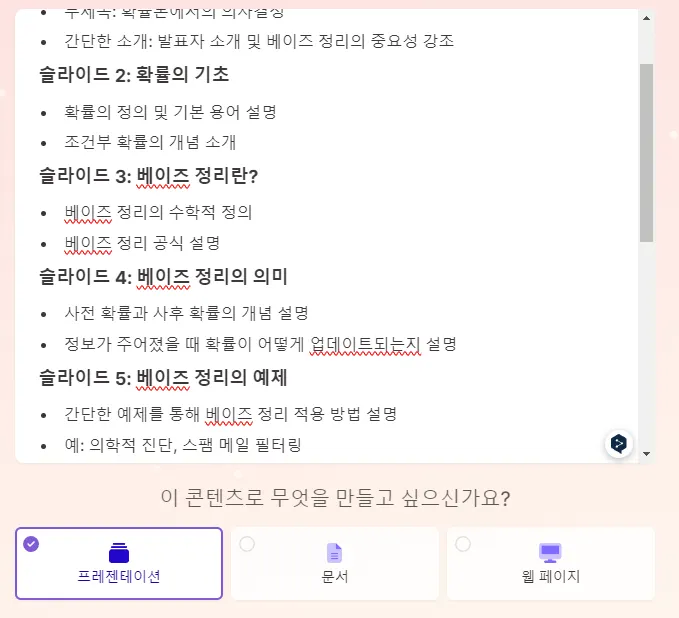 GPT에서 각 슬라이드에 대한 개요에 내용을 추출한 다음, 이것을 바탕으로 PPT를 생성한다면 조금 더 정확한 결과물이 나올지도??