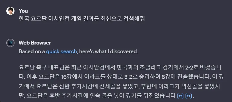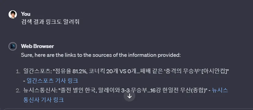 물론  GPTs도 검색 결과 링크를 추가로 요청하면 알려주지만, 처음에는 링크를 알려주지 않는 점이 매우 불편한 듯 느껴짐.