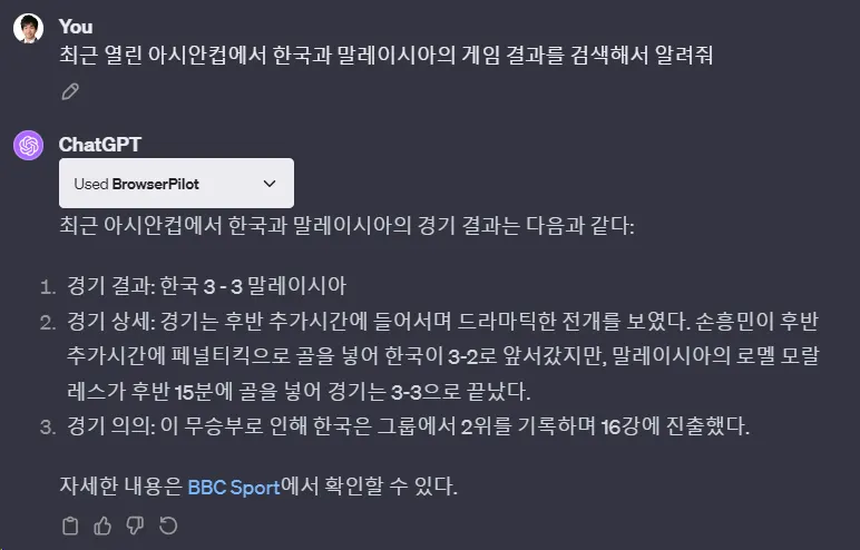 왼쪽은 Browser Plot 플러그인, 오른쪽은 GPTs  Web Browser사용결과 비교