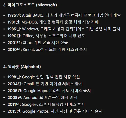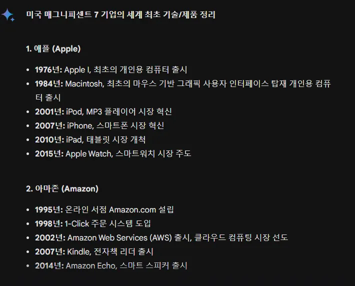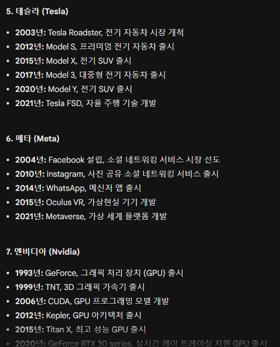 미국의 매그니피센트 7 기업 중 각각의 기업들이 세계최초로 개발하거나 상용화한 기술이나 제품이 있다면 정리해줘
