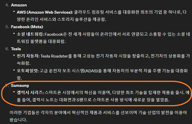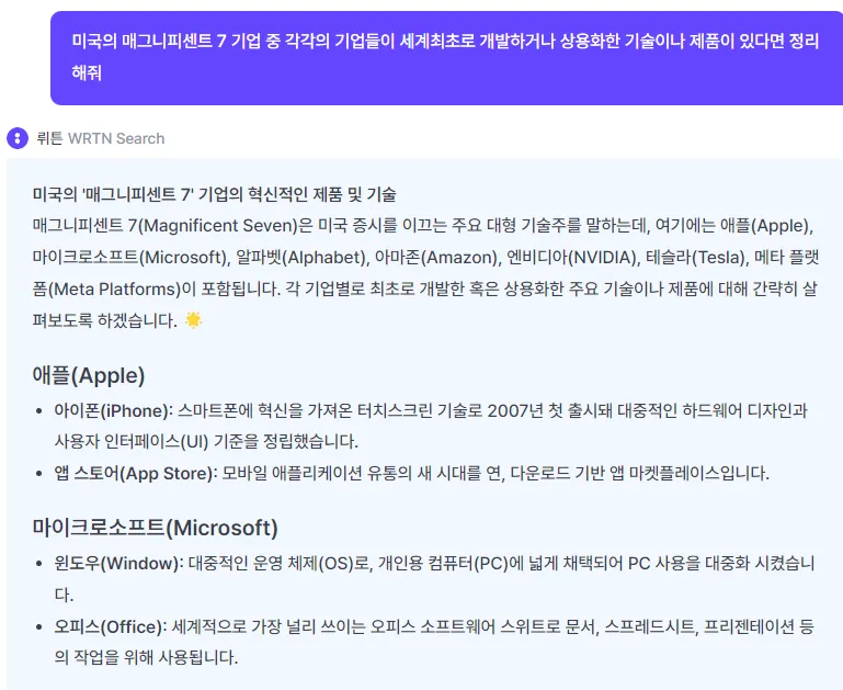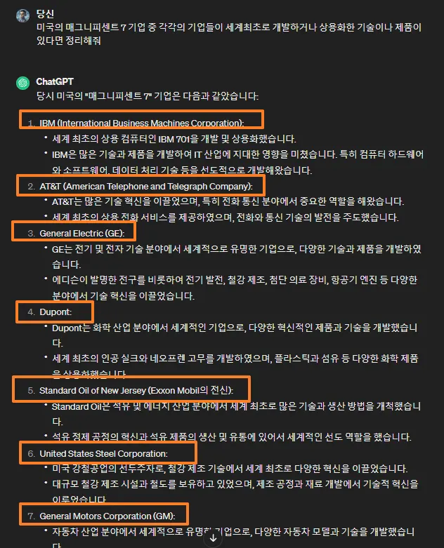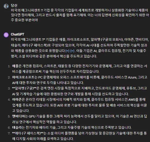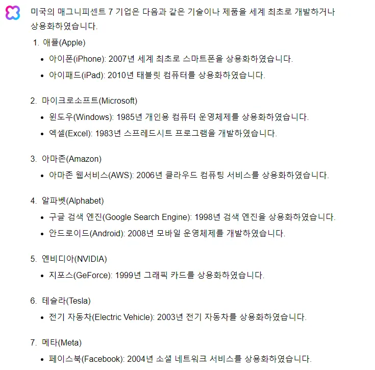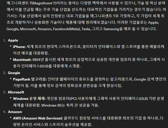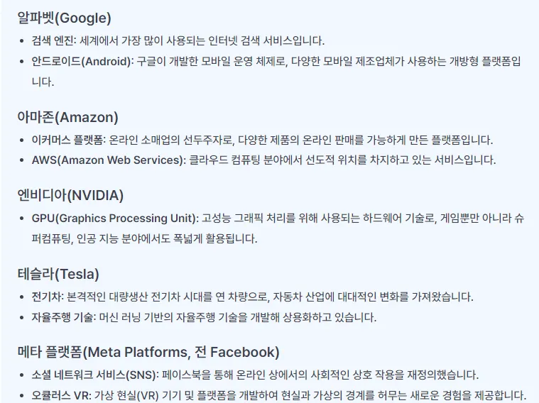 오늘의 프롬프트는 미국의 핫한 7대 기술주(=우리는 이것을 매그니피센트 7)가 가진 특징, 트레이드 마크, 어떤 부분에서 혁신적이였는지?에 대한 것들